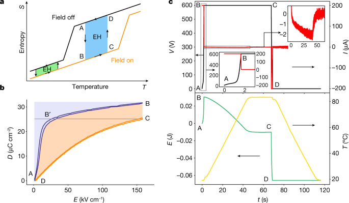 Alternatively, we confirmed these direct measurements of harvested energy with an indirect method. These indirect methods are based on electric displacement field (D)– electric field (E) loops collected at different temperatures and enabling an accurate estimation of how much energy can be harvested by calculating the area in between the two DE loops, as depicted in Fig. 1b. These DE loops were also collected with the Keithley sourcemeter.